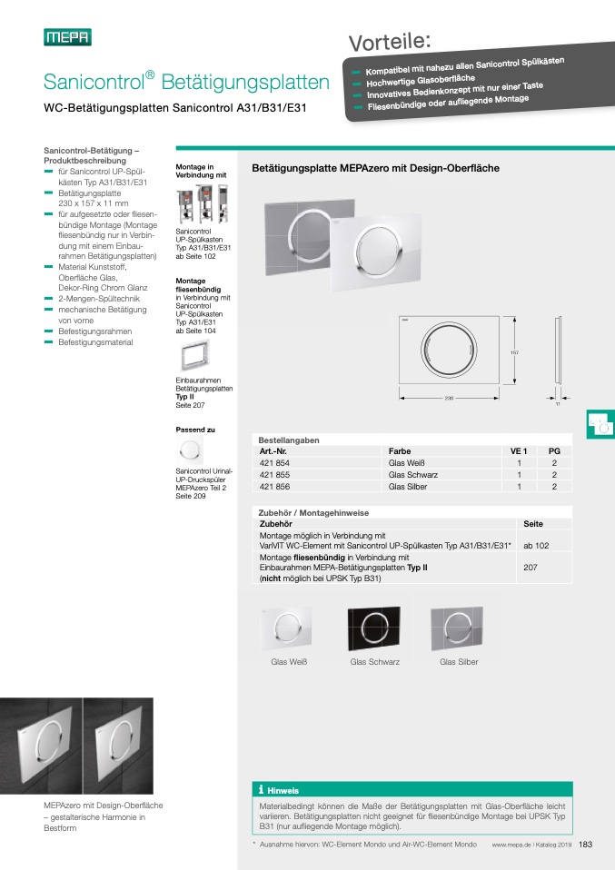 Materialbedingt können die Maße der Betätigungsplatten mit Glas-Oberfläche leicht