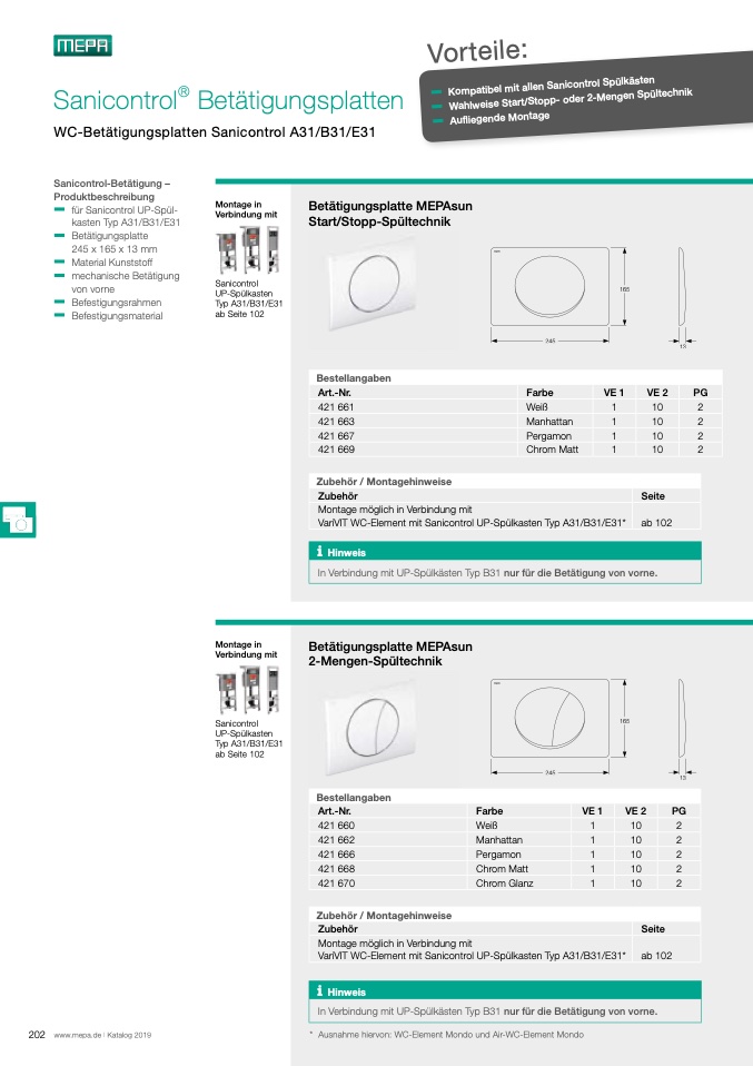 In Verbindung mit UP-Spülkästen Typ B31 nur für die Betätigung von vorne.