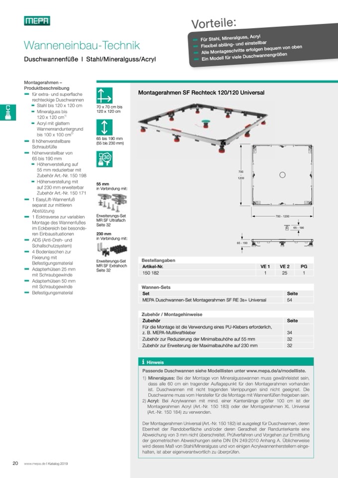 Passende Duschwannen siehe Modelllisten unter www.mepa.de/a/modellliste.