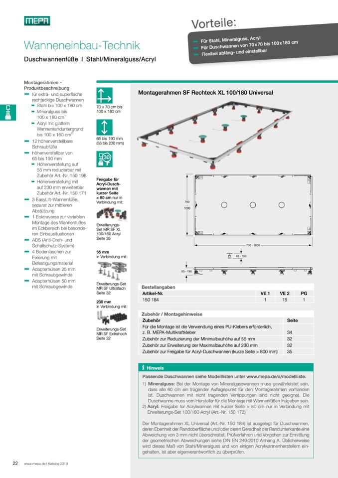 Der Montagerahmen XL Universal (Art.-Nr. 150 184) ist ausgelegt für Duschwannen,