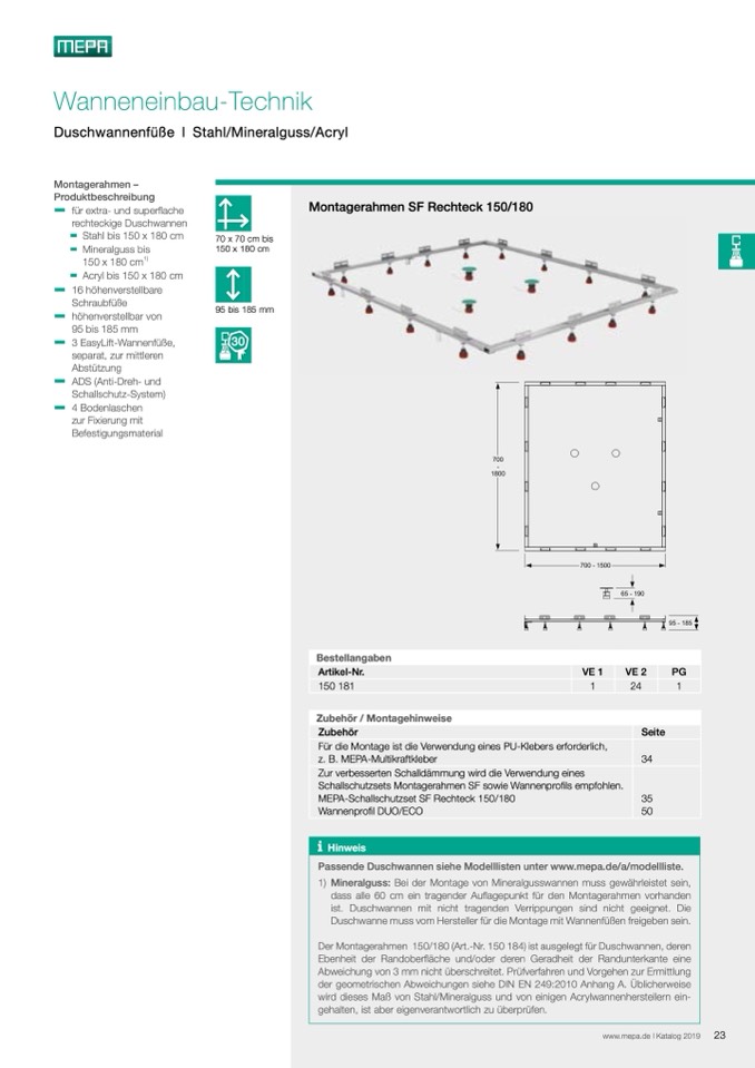 Der Montagerahmen 150/180 (Art.-Nr. 150 184) ist ausgelegt für Duschwannen, deren
