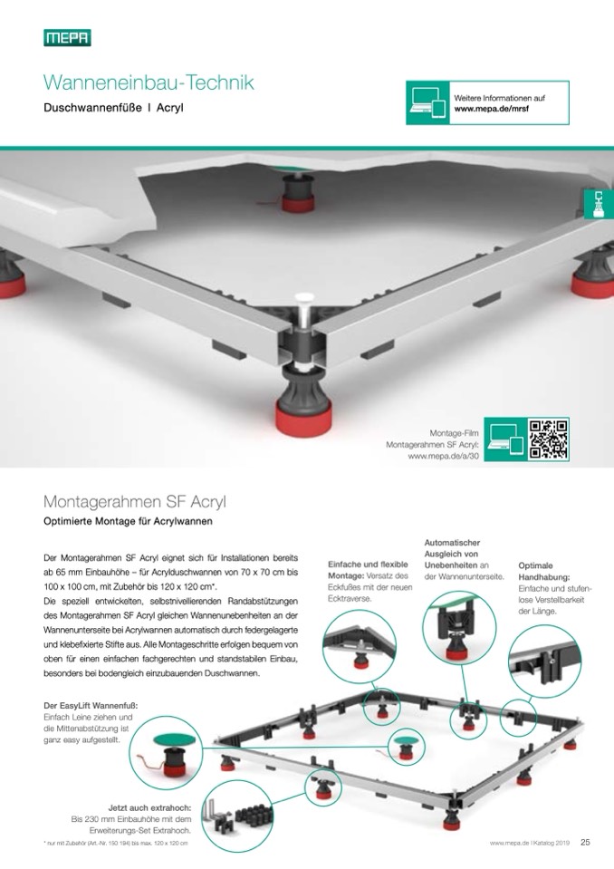 ab 65 mm Einbauhöhe – für Acrylduschwannen von 70 x 70 cm bis