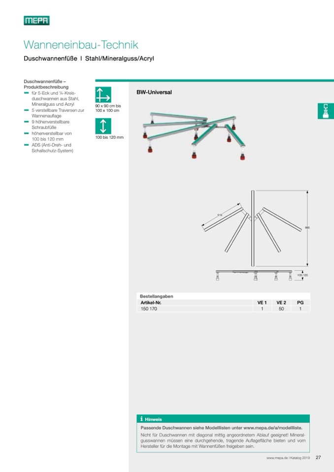 Passende Duschwannen siehe Modelllisten unter www.mepa.de/a/modellliste.