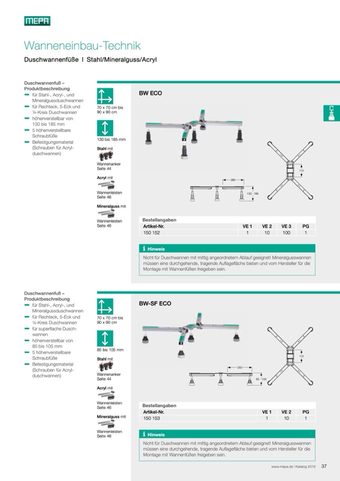 Nicht für Duschwannen mit mittig angeordnetem Ablauf geeignet! Mineralgusswannen