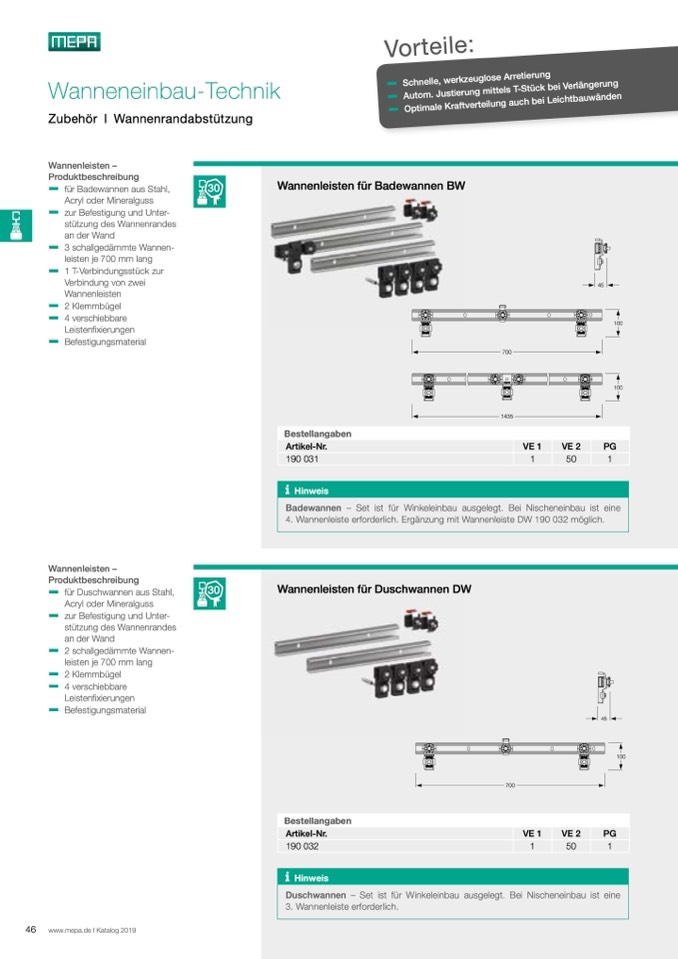 4. Wannenleiste erforderlich. Ergänzung mit Wannenleiste DW 190 032 möglich.