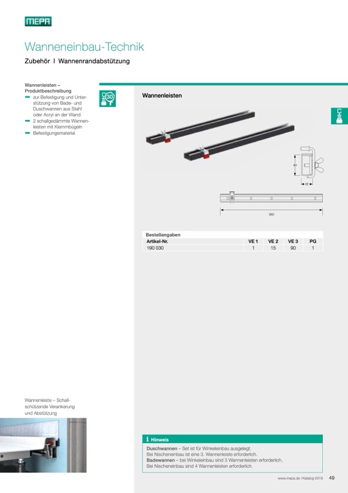 Badewannen – bei Winkeleinbau sind 3 Wannenleisten erforderlich.