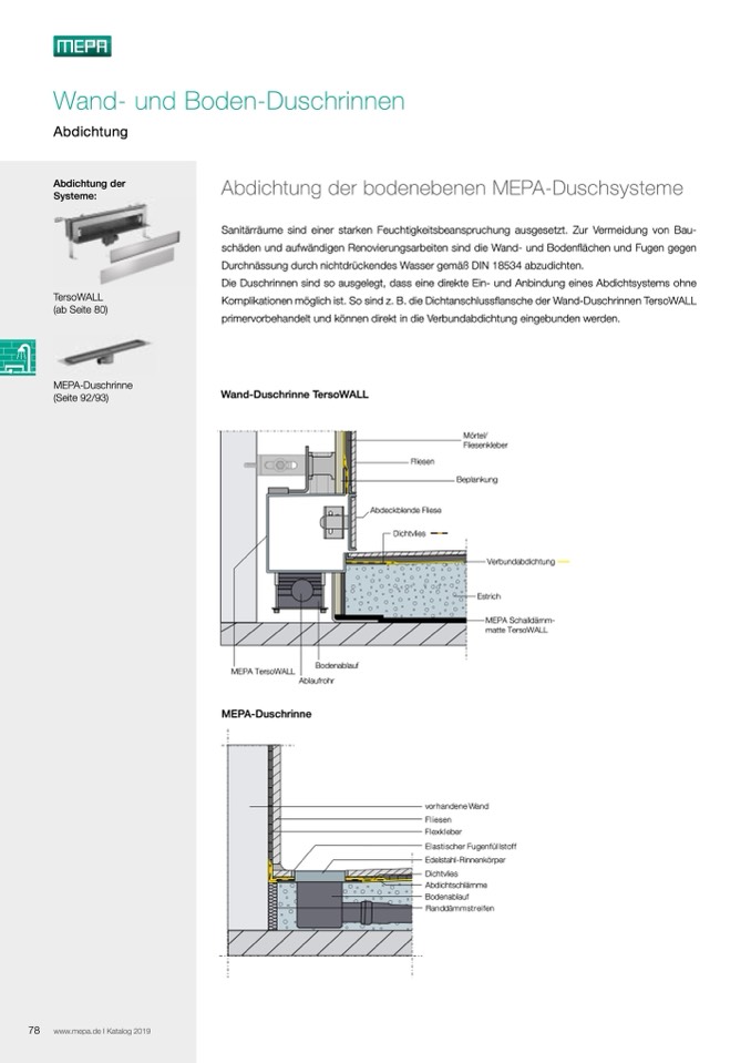 Komplikationen möglich ist. So sind z. B. die Dichtanschlussflansche der Wand-Duschrinnen TersoWALL