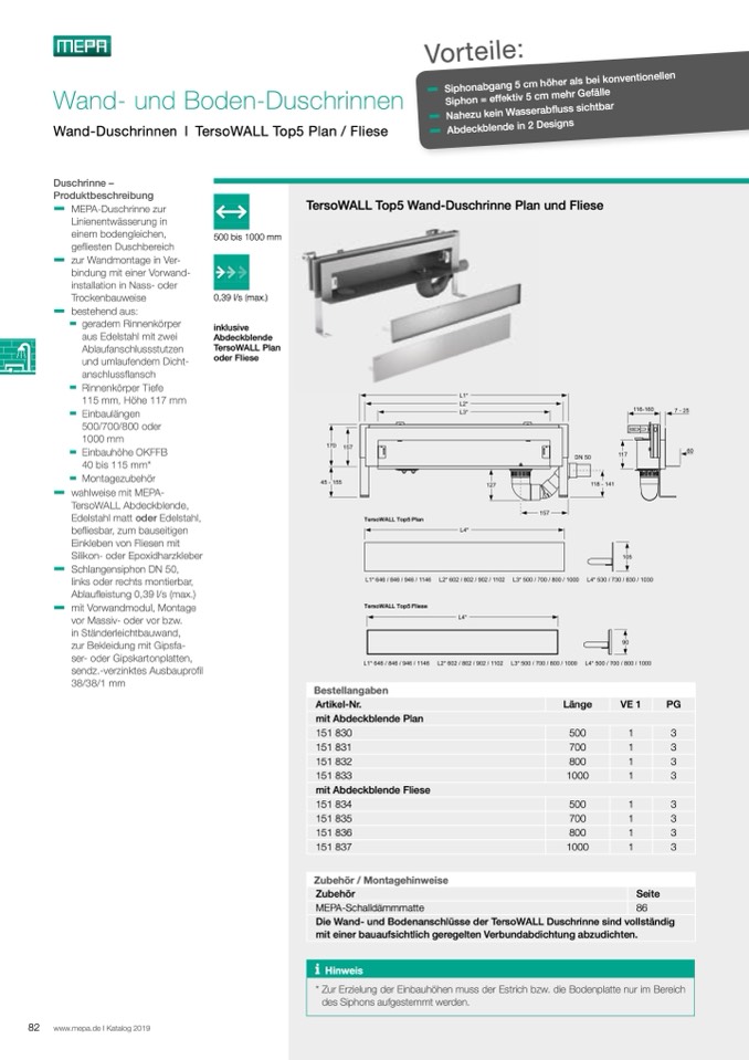 TersoWALL Top5 Wand-Duschrinne Plan und Fliese