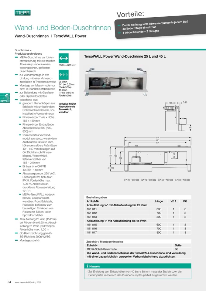 TersoWALL Power Wand-Duschrinne 25 L und 45 L