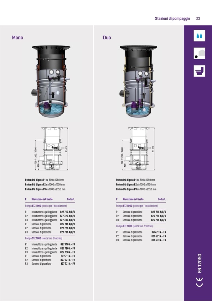 Profondità di posa P1 da 800 a 1250 mm