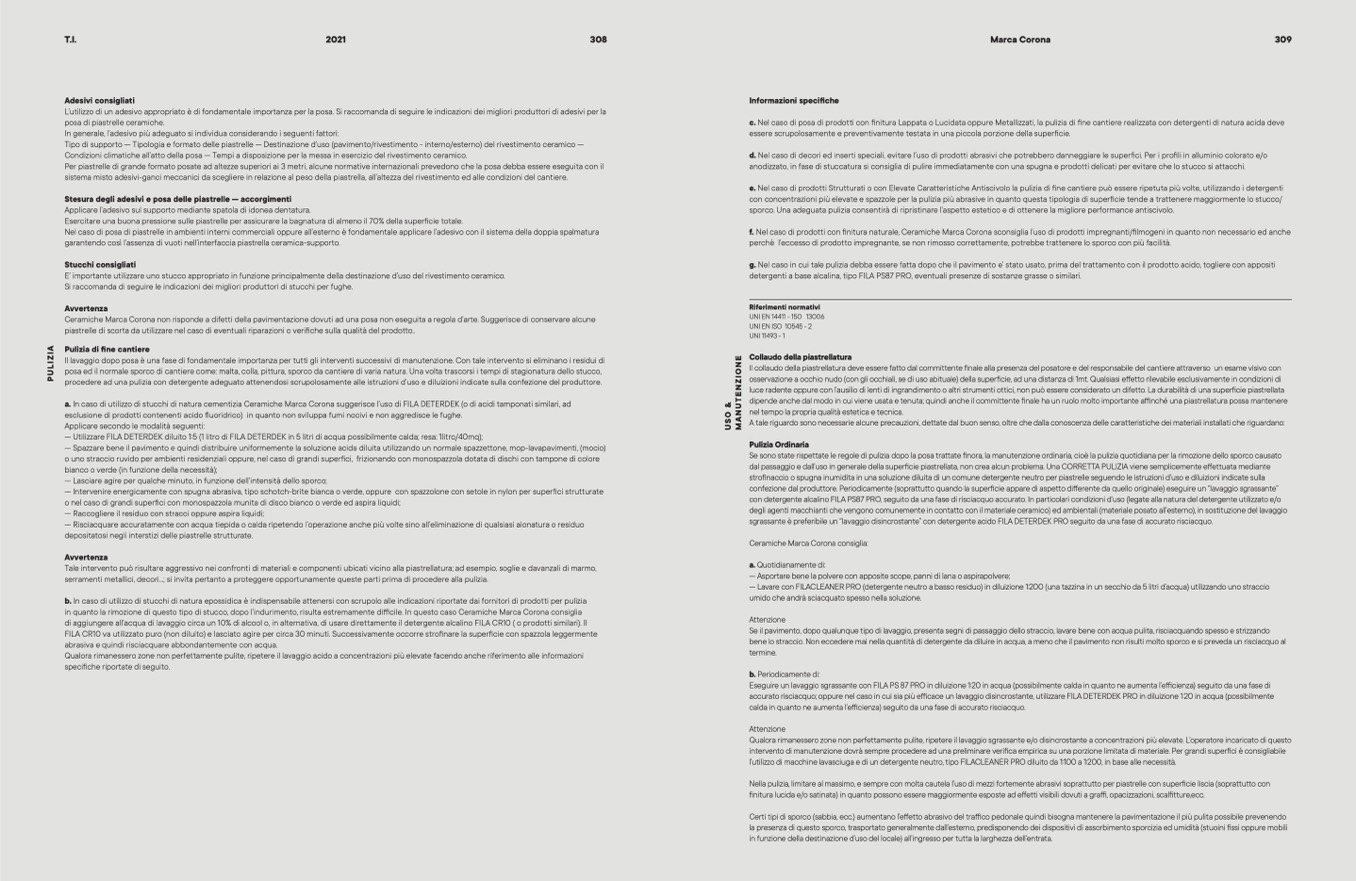 f. Nel caso di prodotti con nitura naturale, Ceramiche Marca Corona sconsiglia l’uso di prodotti impregnanti/lmogeni in quanto non necessario ed anche