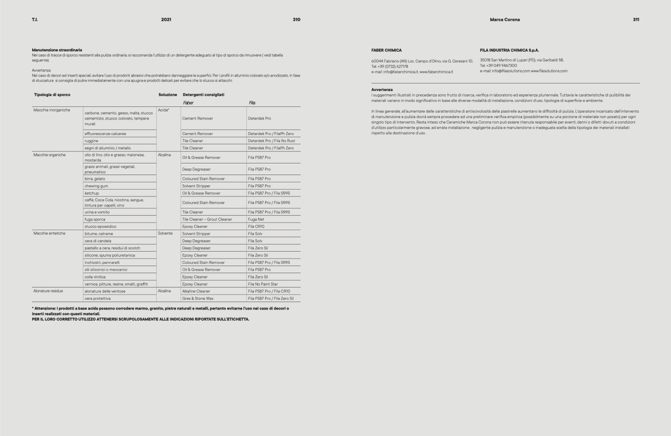 singolo tipo di intervento. Resta inteso che Ceramiche Marca Corona non può essere ritenuta responsabile per eventi, danni o difetti dovuti a condizioni