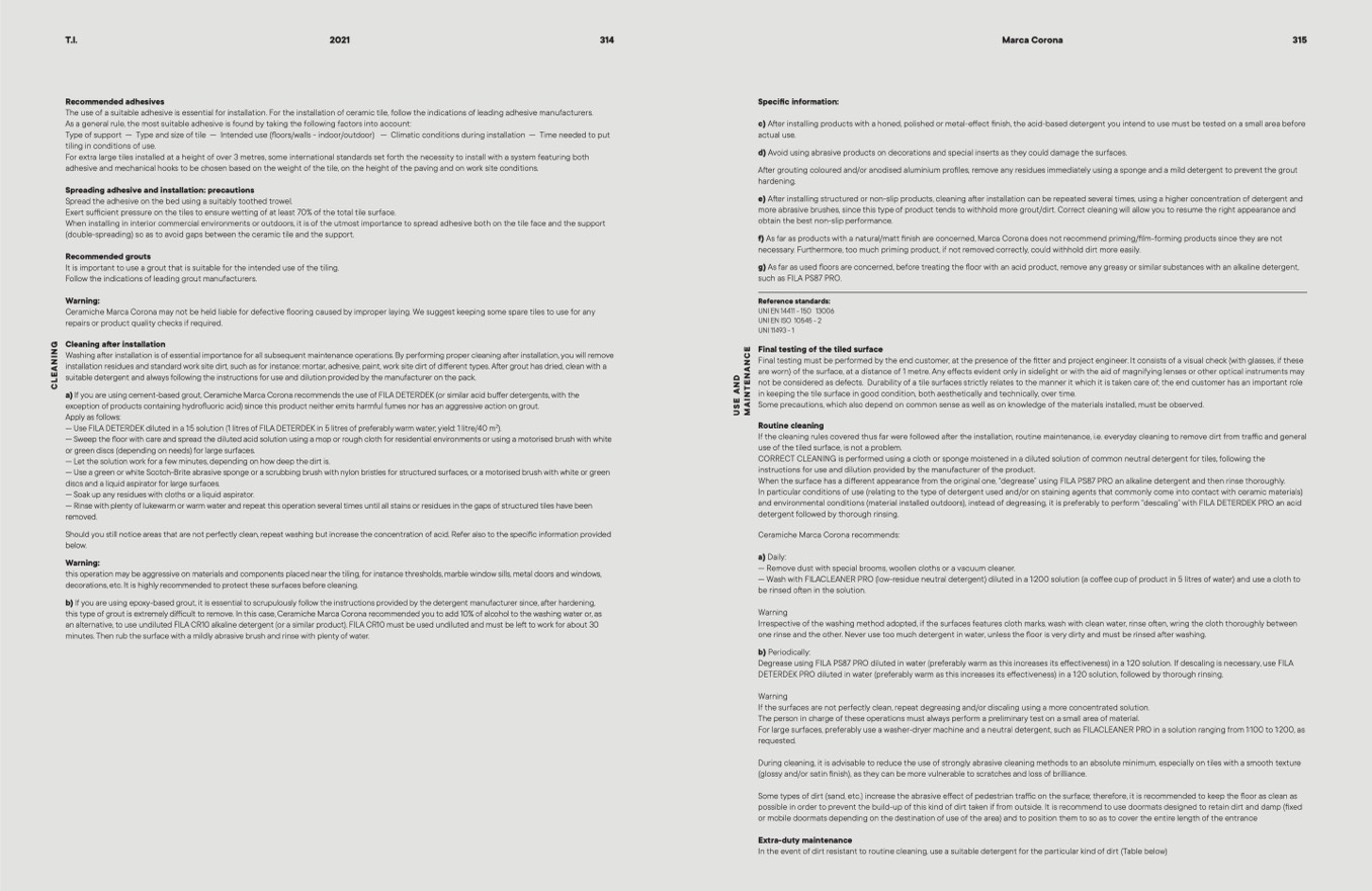 Ceramiche Marca Corona may not be held liable for defective ooring caused by improper laying. We suggest keeping some spare tiles to use for any