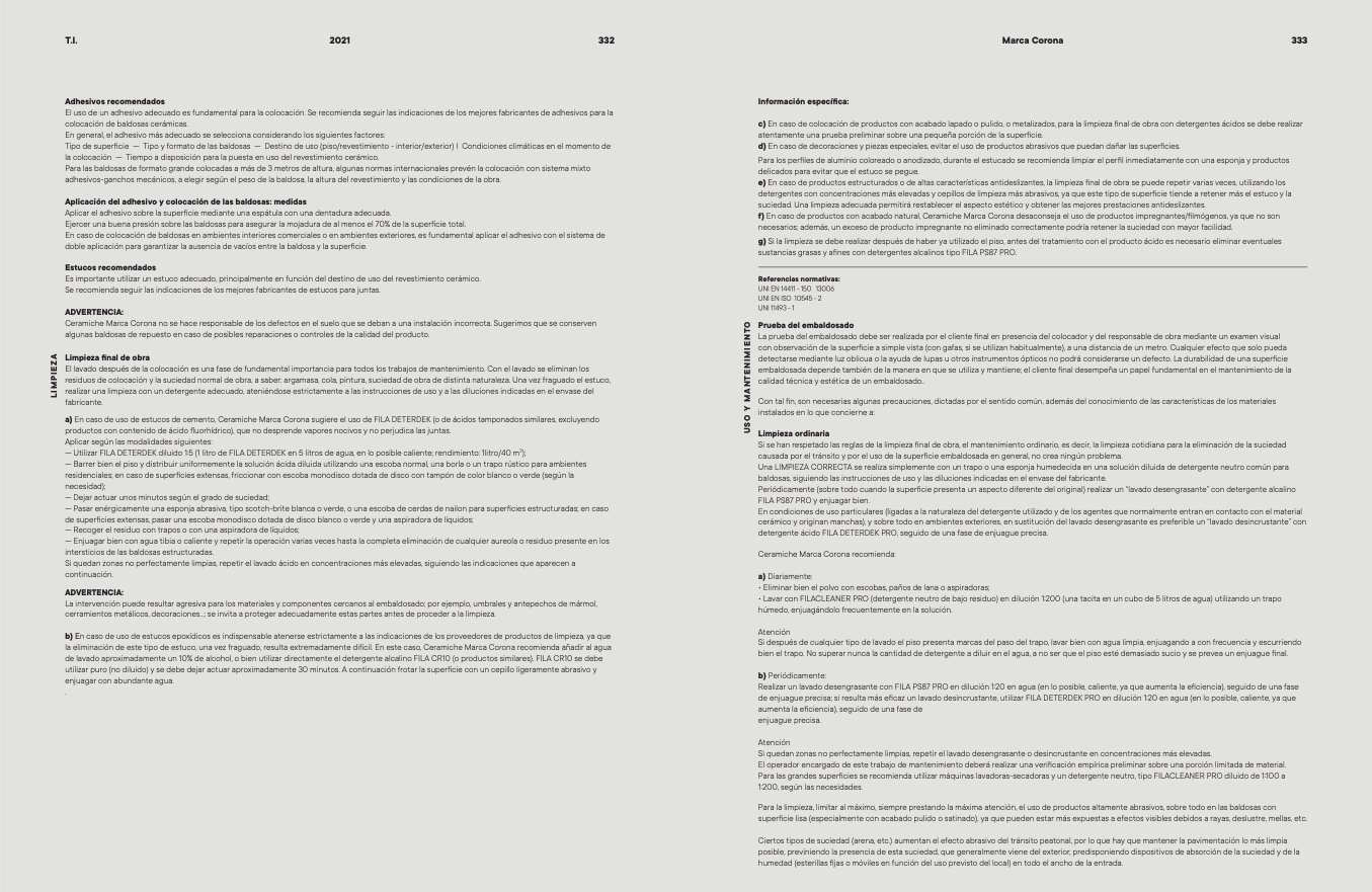 a) En caso de uso de estucos de cemento, Ceramiche Marca Corona sugiere el uso de FILA DETERDE (o de cidos tamponados similares, excluyendo
