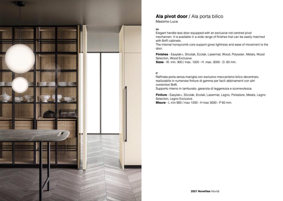 Raffinata porta senza maniglia con esclusivo meccanismo bilico decentrato,