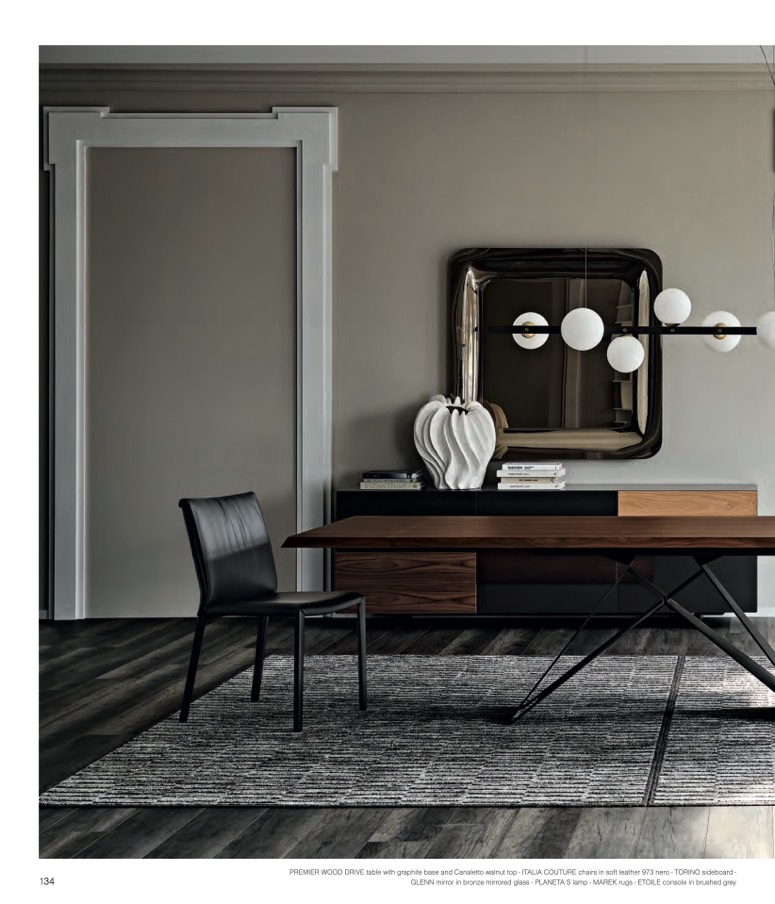 PREMIER WOOD DRIVE table with graphite base and Canaletto walnut top - ITALIA COUTURE chairs in soft leather 973 nero - TORINO sideboard -