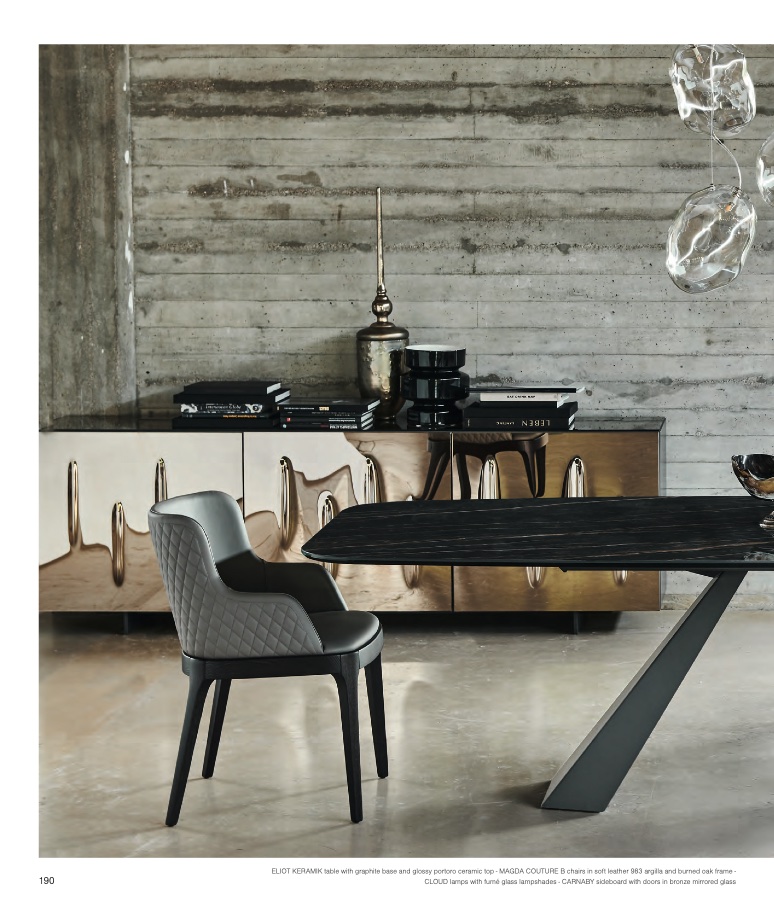 ELIOT KERAMIK table with graphite base and glossy portoro ceramic top - MAGDA COUTURE B chairs in soft leather 983 argilla and burned oak frame -