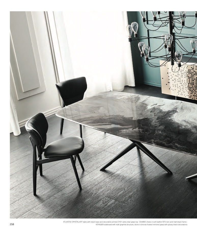 ATLANTIS CRYSTALART table with black base and decorative printed CY01 extra clear glass top - DUMBO chairs in soft leather 973 nero and matt black frame -