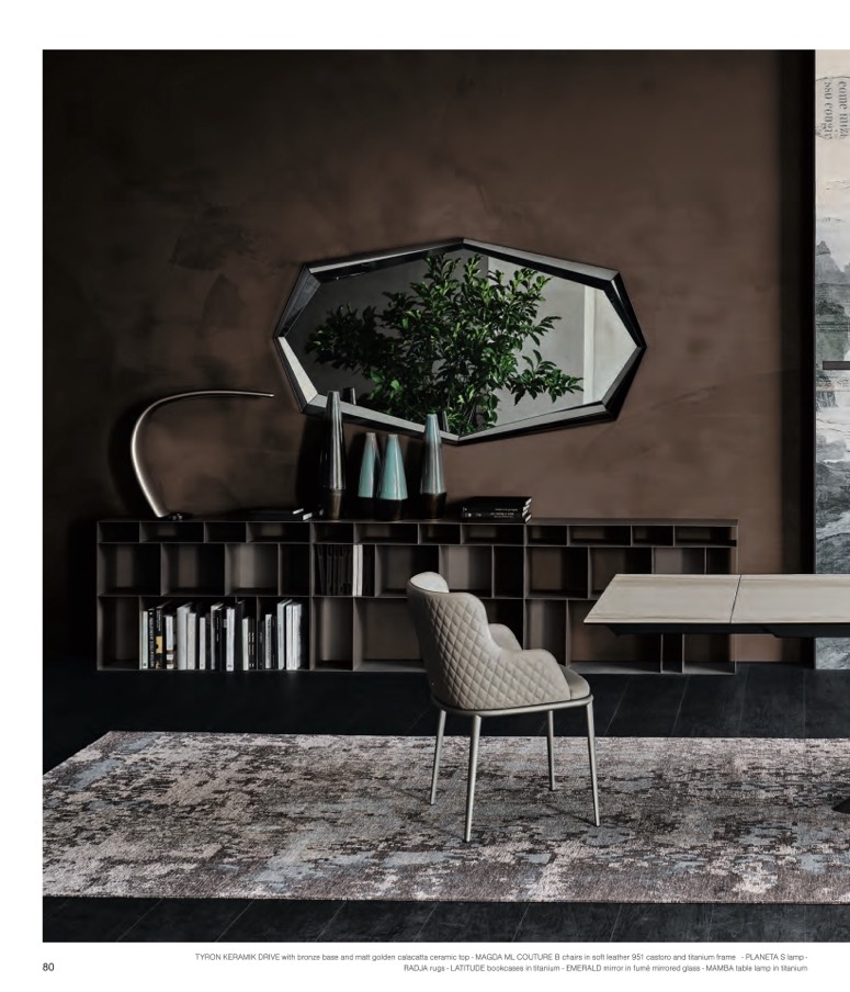 RADJA rugs - LATITUDE bookcases in titanium - EMERALD mirror in fumé mirrored glass - MAMBA table lamp in titanium