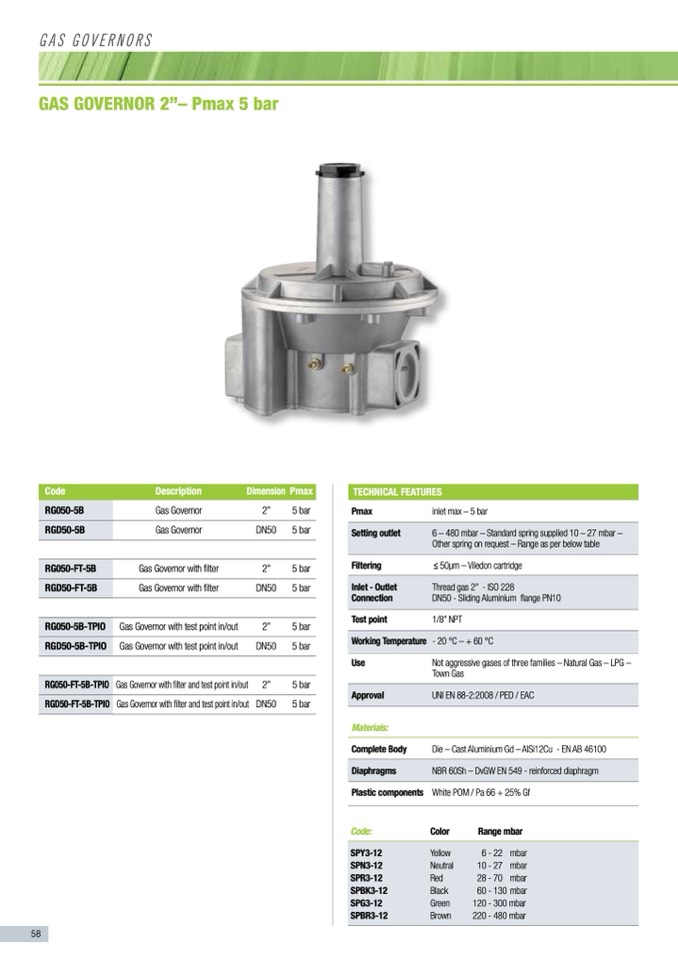 6 – 480 mbar – Standard spring supplied 10 – 27 mbar –