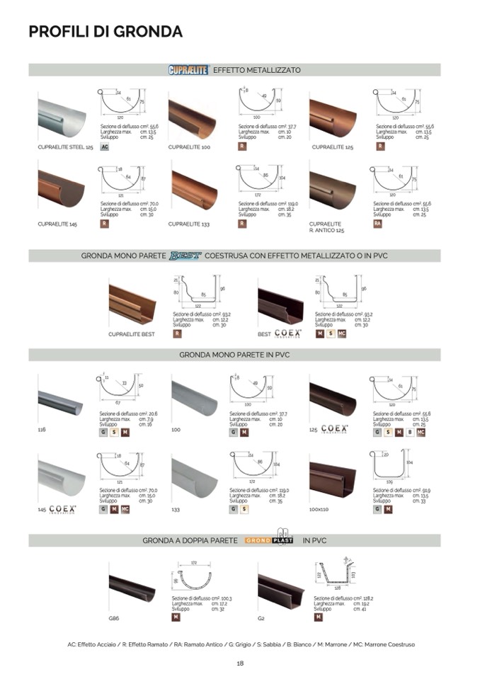 AC: Effetto Acciaio / R: Effetto Ramato / RA: Ramato Antico / G: Grigio / S: Sabbia / B: Bianco / M: Marrone / MC: Marrone Coestruso