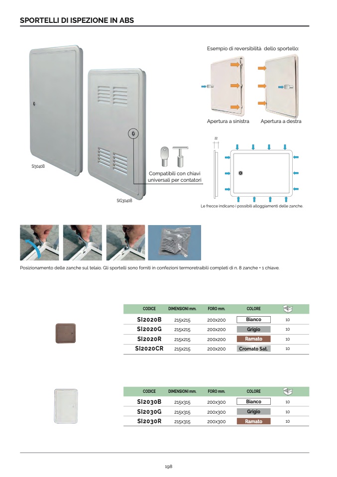 Posizionamento delle zanche sul telaio. Gli sportelli sono forniti in confezioni termoretraibili completi di n. 8 zanche + 1 chiave.