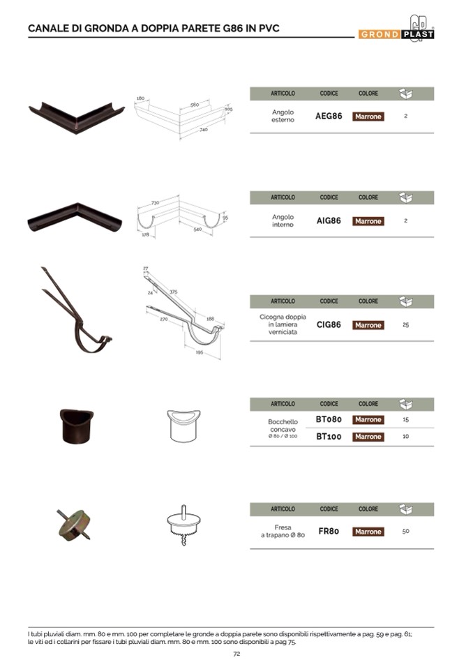 I tubi pluviali diam. mm. 80 e mm. 100 per completare le gronde a doppia parete sono disponibili rispettivamente a pag. 59 e pag. 61;