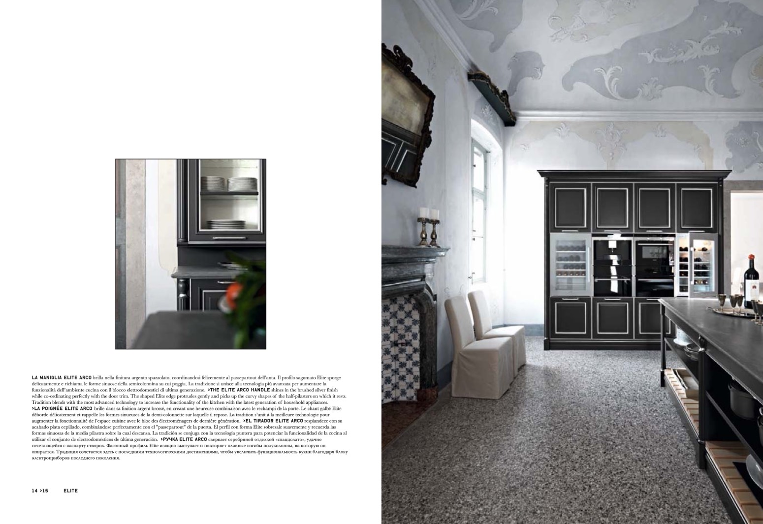 brilla nella finitura argento spazzolato, coordinandosi felicemente al passepartout dell’anta. Il profilo sagomato Elite sporge