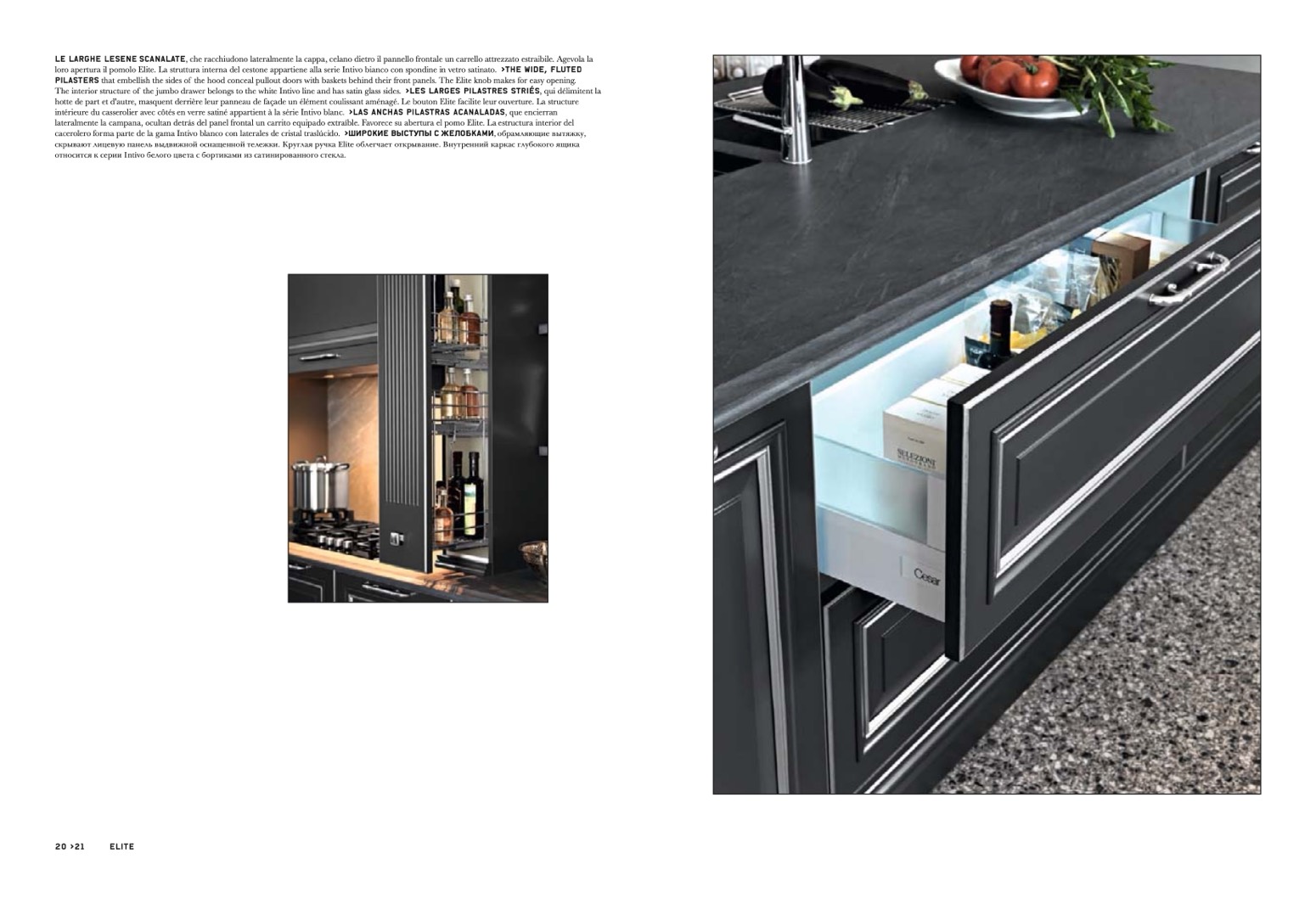 lateralmente la campana, ocultan detrás del panel frontal un carrito equipado extraíble. Favorece su abertura el pomo Elite. La estructura interior del