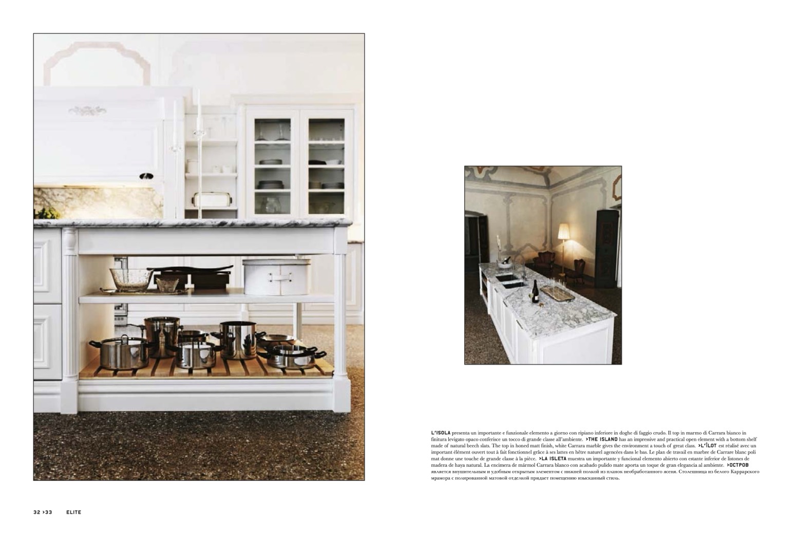 является внушительным и удобным открытым элементом с нижней полкой из планок необработанного ясеня. Столешница из белого Каррарского