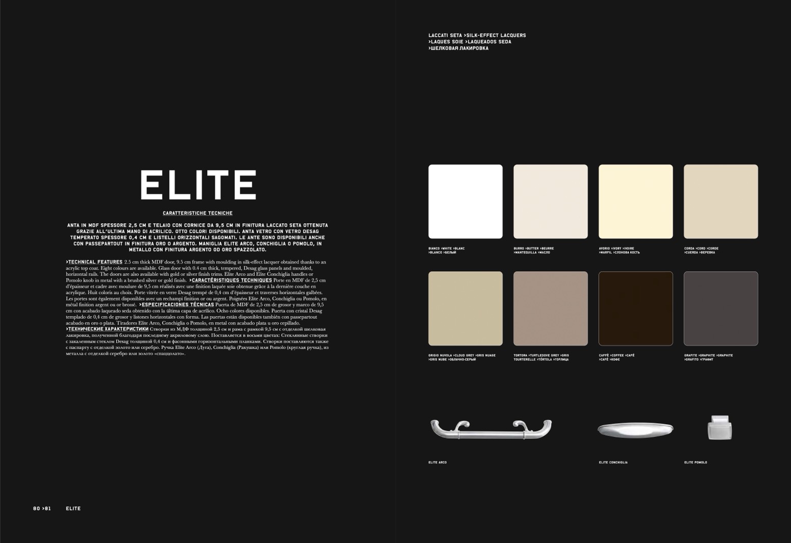 horizontal rails. The doors are also available with gold or silver finish trims. Elite Arco and Elite Conchiglia handles or