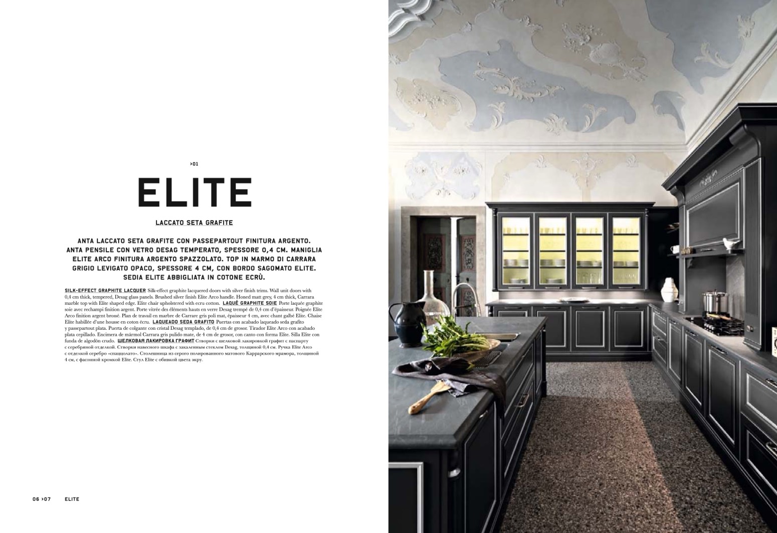 plata cepillado. Encimera de mármol Carrara gris pulido mate, de 4 cm de grosor, con canto con forma Elite. Silla Elite con