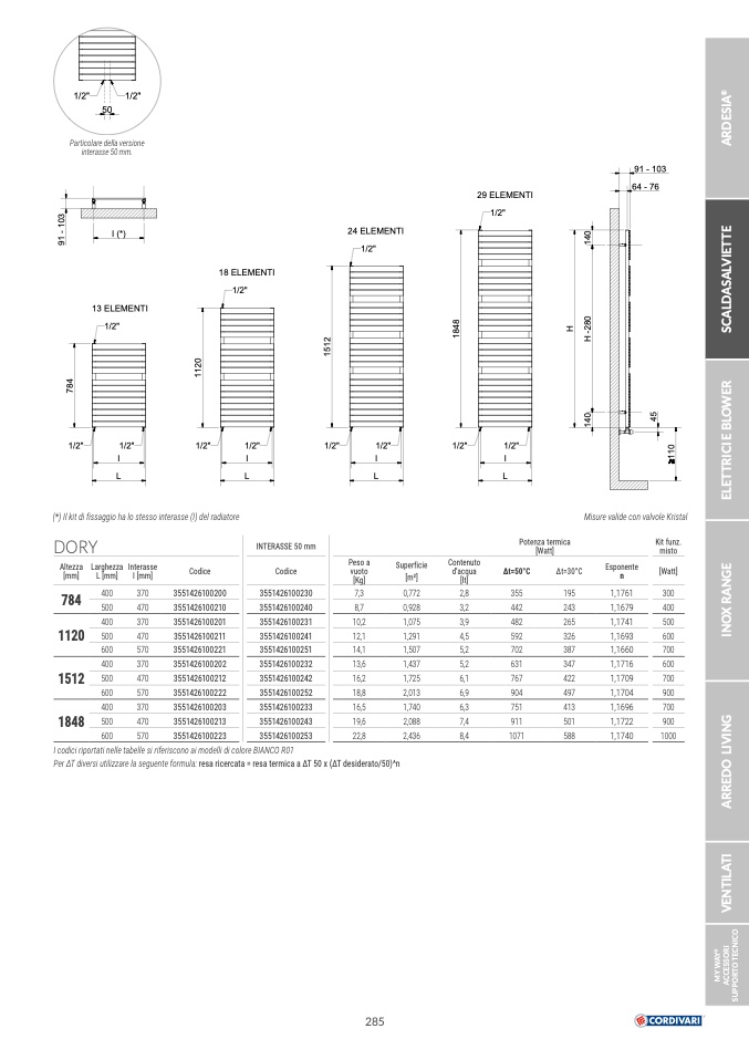 Per ΔT diversi utilizzare la seguente formula: resa ricercata = resa termica a ΔT 50 x (ΔT desiderato/50)^n