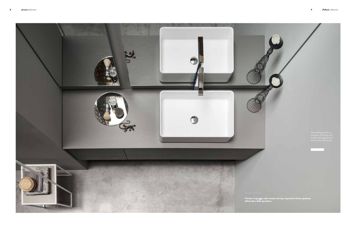 Il lavabo si appoggia sulle venature del top e riprende le forme squadrate