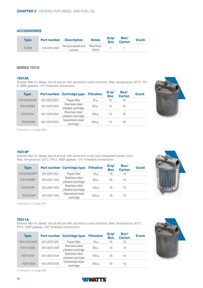 Strainer filter for diesel, fuel oil and air with aluminium cover and bowl. Max. temperature: 90°C. PN