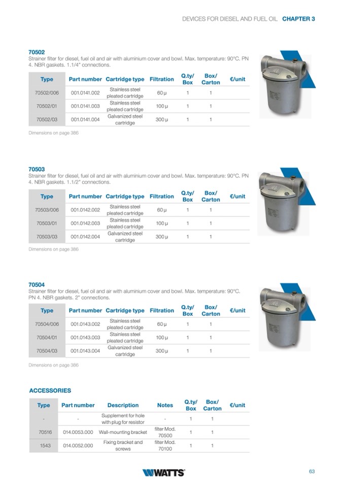 Strainer filter for diesel, fuel oil and air with aluminium cover and bowl. Max. temperature: 90°C.