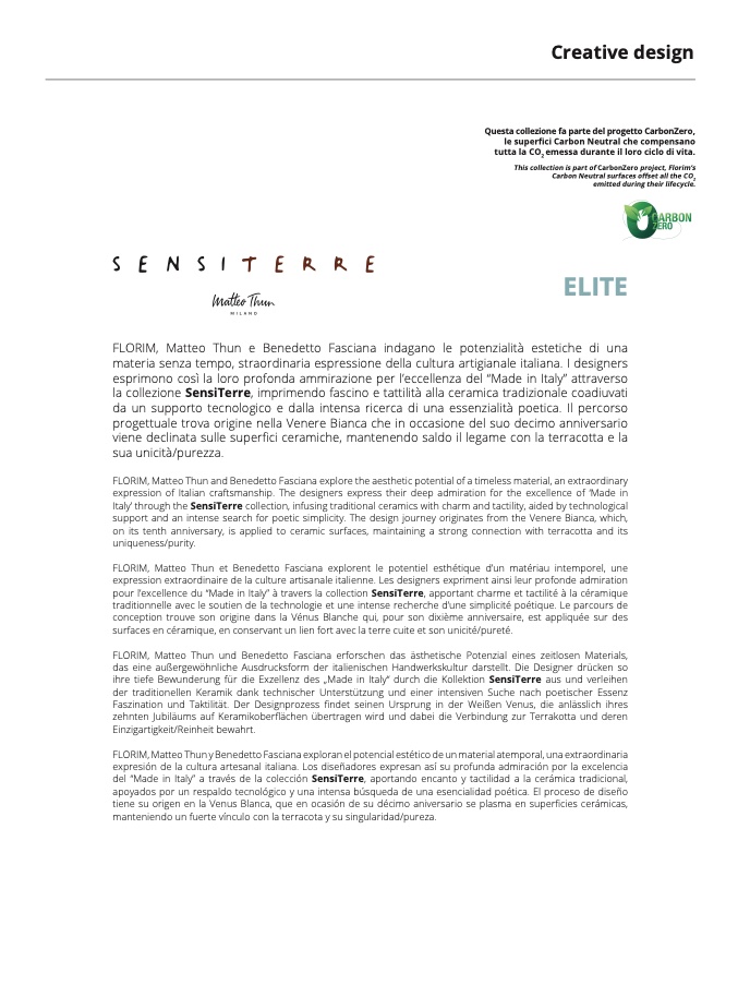 pour l’excellence du “Made in Italy” à travers la collection SensiTerre, apportant charme et tactilité à la céramique