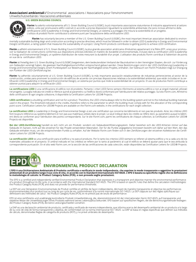 fication, a rating system that measures the sustainability of a project. Using Florim products contributes to getting points to achieve LEED certification