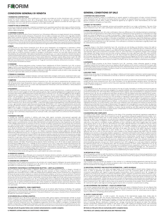 The sale is always ex-works at the Florim Ceramiche S.p.A. SB premises, unless otherwise agreed in writing.