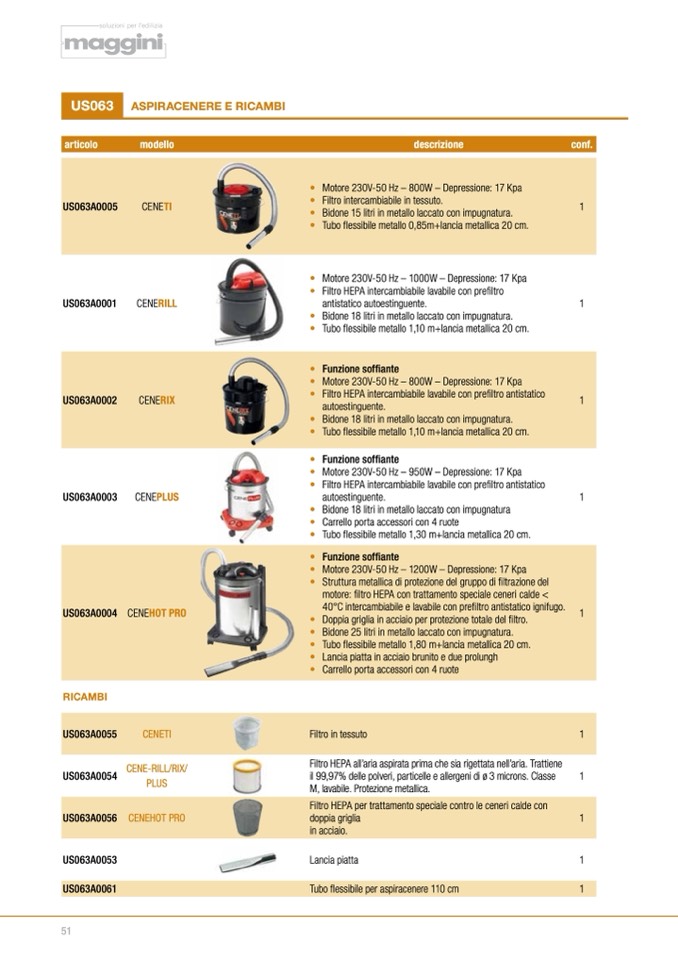 • Motore 230V-50 Hz – 800W – Depressione: 17 Kpa