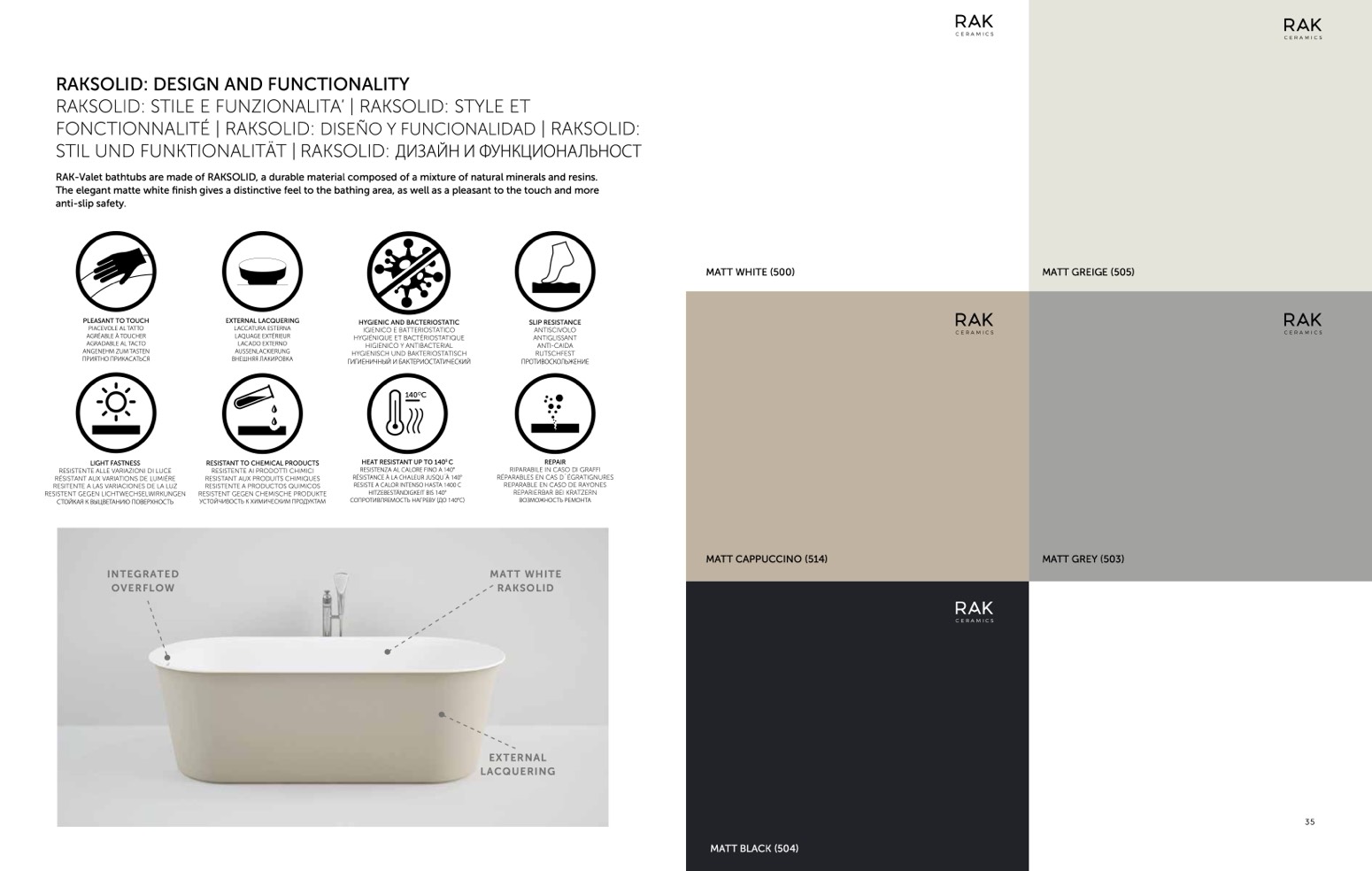 RAK-Valet bathtubs are made of RAKSOLID, a durable material composed of a mixture of natural minerals and resins.