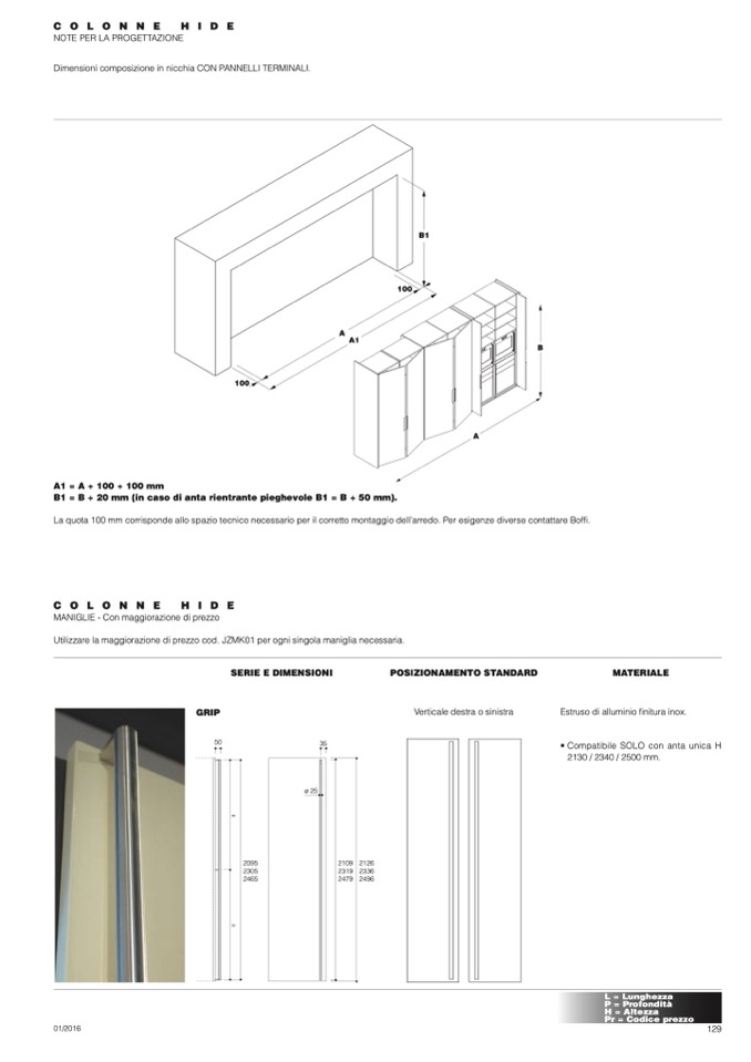 B1 = B + 20 mm (in caso di anta rientrante pieghevole B1 = B + 50 mm).