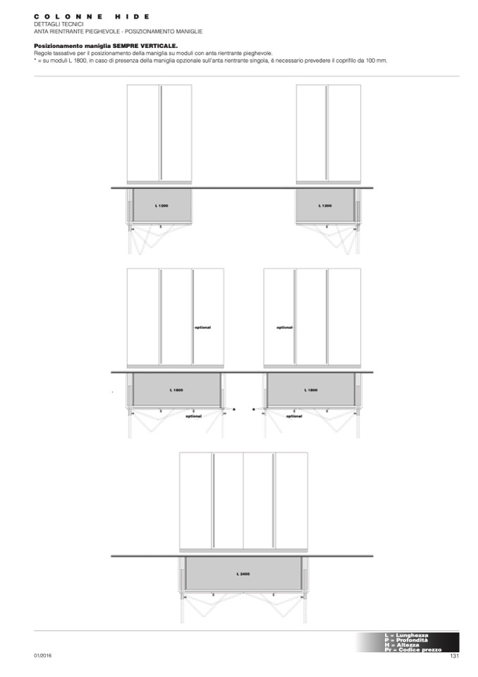 * = su moduli L 1800, in caso di presenza della maniglia opzionale sull’anta rientrante singola, è necessario prevedere il coprifilo da 100 mm.
