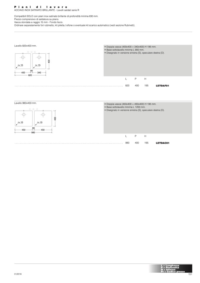 • Doppia vasca (450x400 + 450x400) H 195 mm.