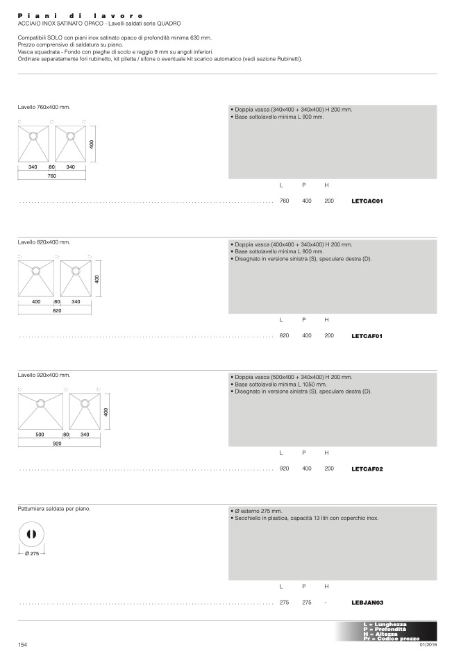 Compatibili SOLO con piani inox satinato opaco di profondità minima 630 mm.