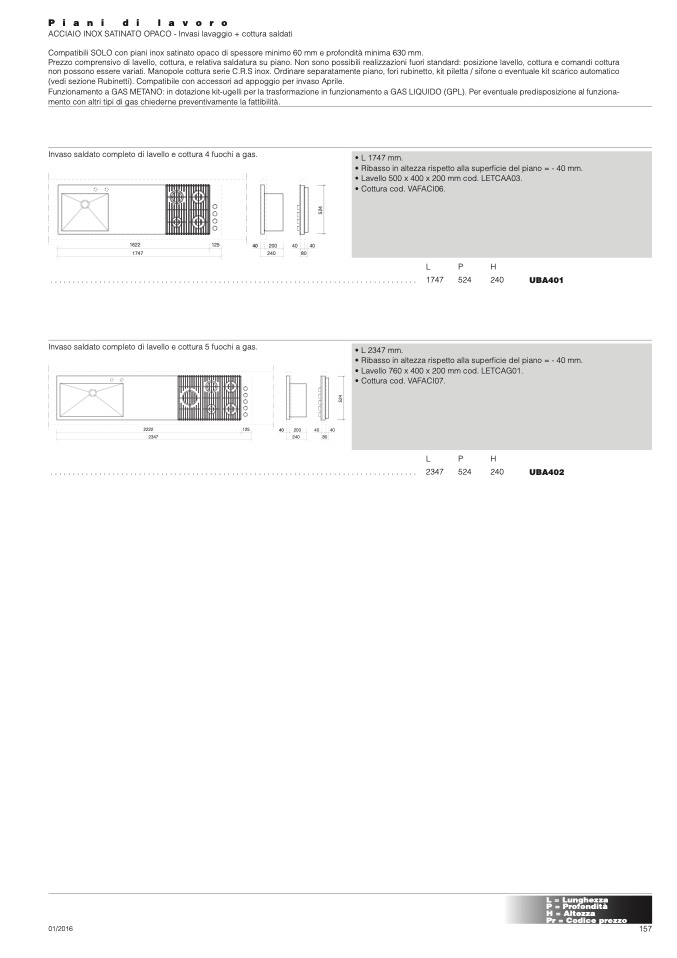 Compatibili SOLO con piani inox satinato opaco di spessore minimo 60 mm e profondità minima 630 mm.