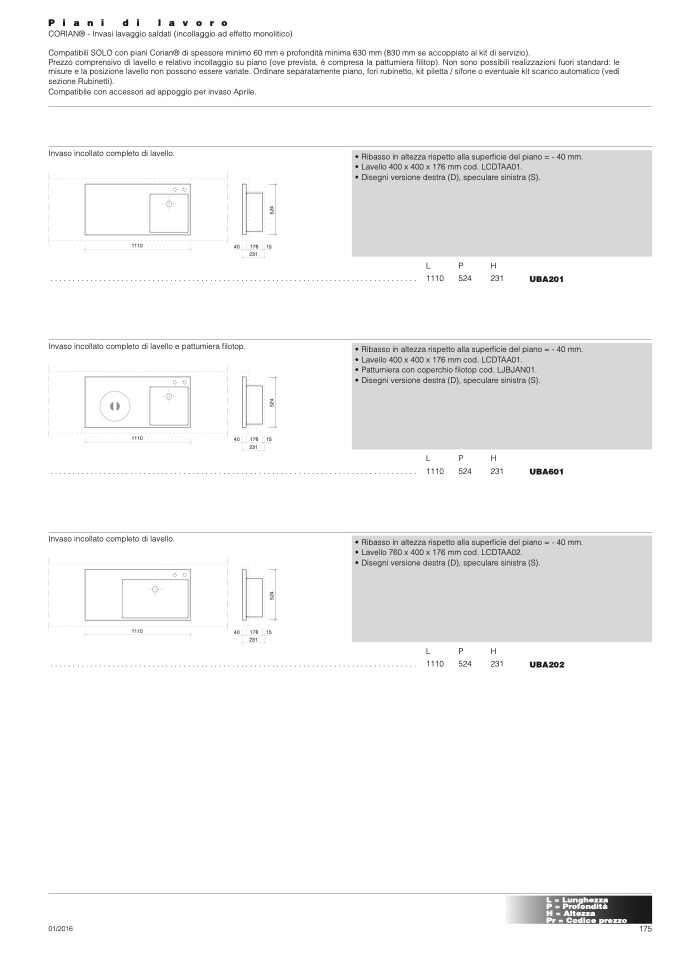 Compatibili SOLO con piani Corian® di spessore minimo 60 mm e profondità minima 630 mm (830 mm se accoppiato al kit di servizio).