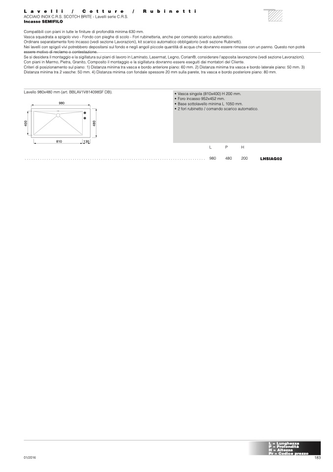 Lavello 980x480 mm (art. BBLAV1V814098SF DB).
