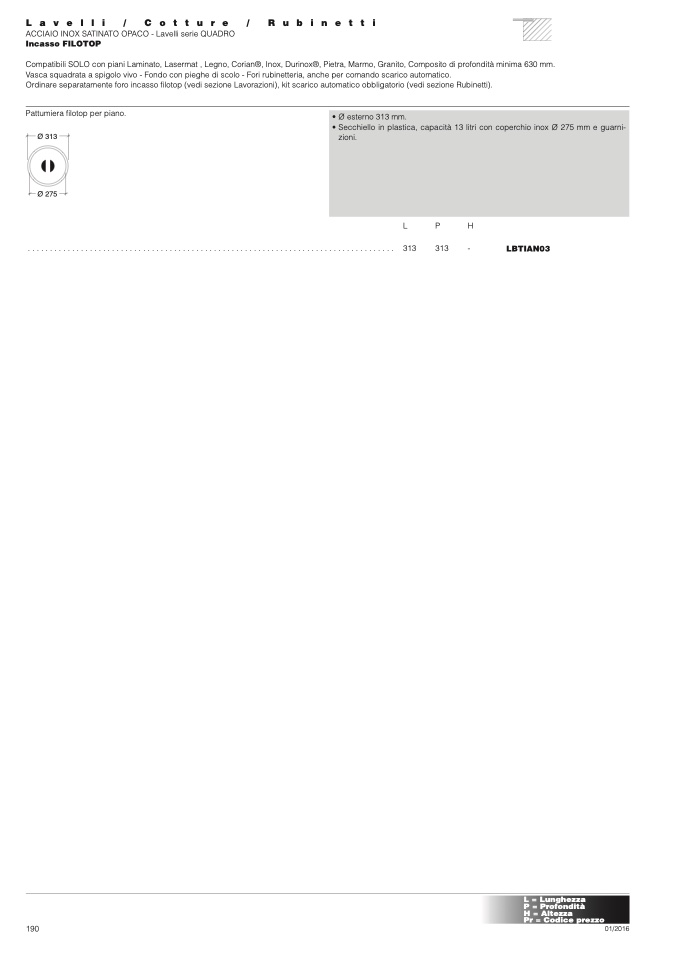 Ordinare separatamente foro incasso filotop (vedi sezione Lavorazioni), kit scarico automatico obbligatorio (vedi sezione Rubinetti).