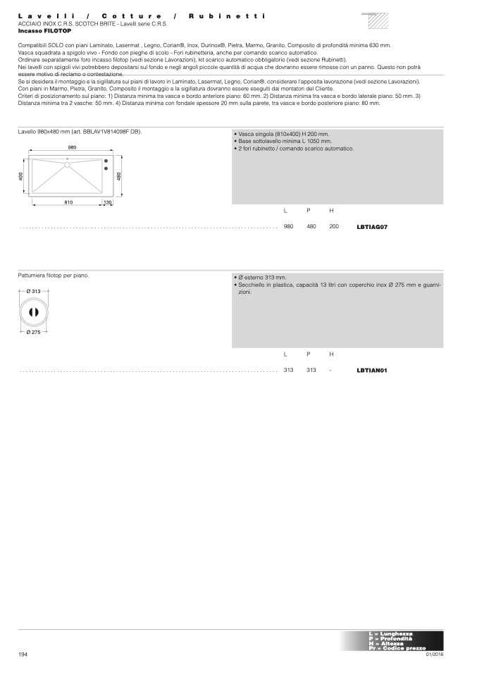 Ordinare separatamente foro incasso filotop (vedi sezione Lavorazioni), kit scarico automatico obbligatorio (vedi sezione Rubinetti).